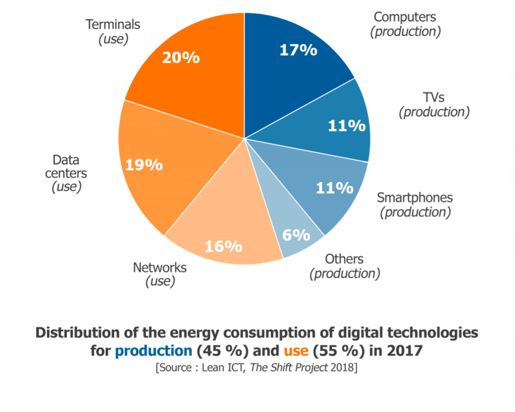 Not only does manufacturing electronic devices generate a lot of carbon dioxide, but using them also consumes energy which results in emissions. It represents 55 percent of the digital emissions. For example, it takes quite a bit of electricity to power all those computers, smartphones, printers, and other electronic equipment. But we must take in account the consumption of the datacenters and networks too because it represents the largest share of CO2 emissions when you use a device.